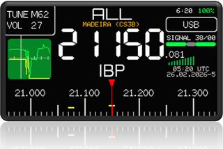 International Beacon Project (IBP): Das NCDXF/IARU-Bakenprojekt besteht aus 18 weltweit verteilten Amateurfunkbaken, die im 3-Minuten-Zyklus automatisch senden. Jede Bake überträgt ihr Rufzeichen und vier Träger mit absteigender Leistung (100 W, 10 W, 1 W, 0,1 W). Die Aussendung erfolgt sequentiell über fünf Frequenzen: 14100, 18110, 21150, 24930 und 28200 kHz. Jede Bake sendet 10 s pro Frequenz und wechselt dann zur nächsten höheren Frequenz. Dadurch sind zu jedem Zeitpunkt fünf verschiedene Baken aktiv, jeweils eine pro Band. Nach 50 s wechselt die nächste Bake in der globalen Reihenfolge. Der vollständige Durchlauf aller 18 Baken dauert 180 s. Die Firmware bestimmt anhand der UTC-Zeit und des Bandes, welche Bake aktuell auf der gewählten Frequenz aktiv ist und zeigt das Ergebnis oberhalb der Frequenz an.