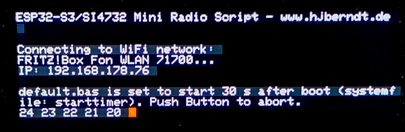 Die speziellen Mini-Radio-Befehle und Funktionen sind in der Referenz zu esp32Script angehängt. Zuviele HTML-Elemente (Buttons usw.) können den Programmlauf erschweren. Eine schlechte WiFi-Verbindung zur Programmierzeit verursacht unkontrollierte Hänger!