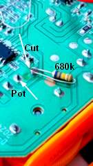 Die Abstimmung erfolgt intern über ein Potentiometer von 100k in der Grundausführung. Trennt man einen der der beiden Außenanschlüsse zwischen Poti und DSP-Chip und legt ein 680k Widerstand in Reihe, so erhält man den linken Anfangsbereich der Skala gestreckt. Für Kurzwelle ist das dann ein Bereich von ca. 5600 bis 7000 kHz, wie gewünscht. Allerdings gilt das dann auch für alle anderen Bereiche, so dass bei FM1 nur noch 88 MHz gehört werden kann und auf MW abends nur 540 kHz.