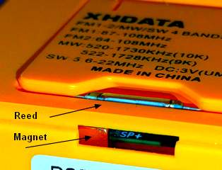 Der auf der Rückseite klappbare Ständer dient als Schaltvorrichtung. Optimal wäre ein Reed-Kontakt im Inneren des Radios und eine starke Magnetfolie an der Klappe. Da gerade keine starke Folie verfügbar ist, erfolgt der umgekehrte Weg. Ein kleiner Neodym-Magnet auf der Platine schaltet einen auf der Klappe angebrachren Reed-Kontakt. Dünne Drähte führen vom Kontakt durch die beiden schmalen Schlitze der Klappe zum Widerstand im Gehäuse.