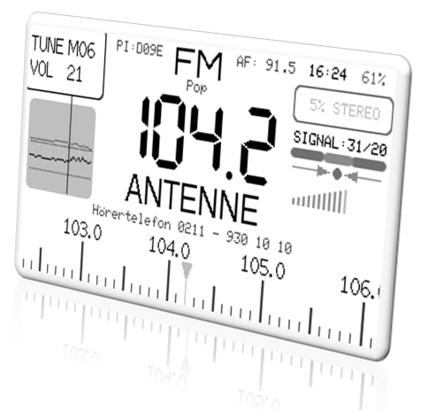 Die Software startet mit einem kurzen Splash-Screen und stellt sich danach in etwa wie folgt dar: Der voreingestellte sogenannte Info-Modus stellt möglichst viele Informationen auf dem Bildschirm dar. In der Abbildung wird ein UKW-Sender auf 104,2 MHz um 11:21 Uhr empfangen.